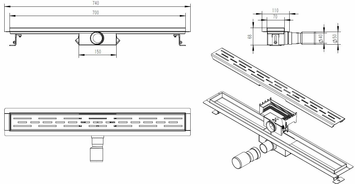 Gunmetal douchegoot 40mm aansl. +flens 70×7