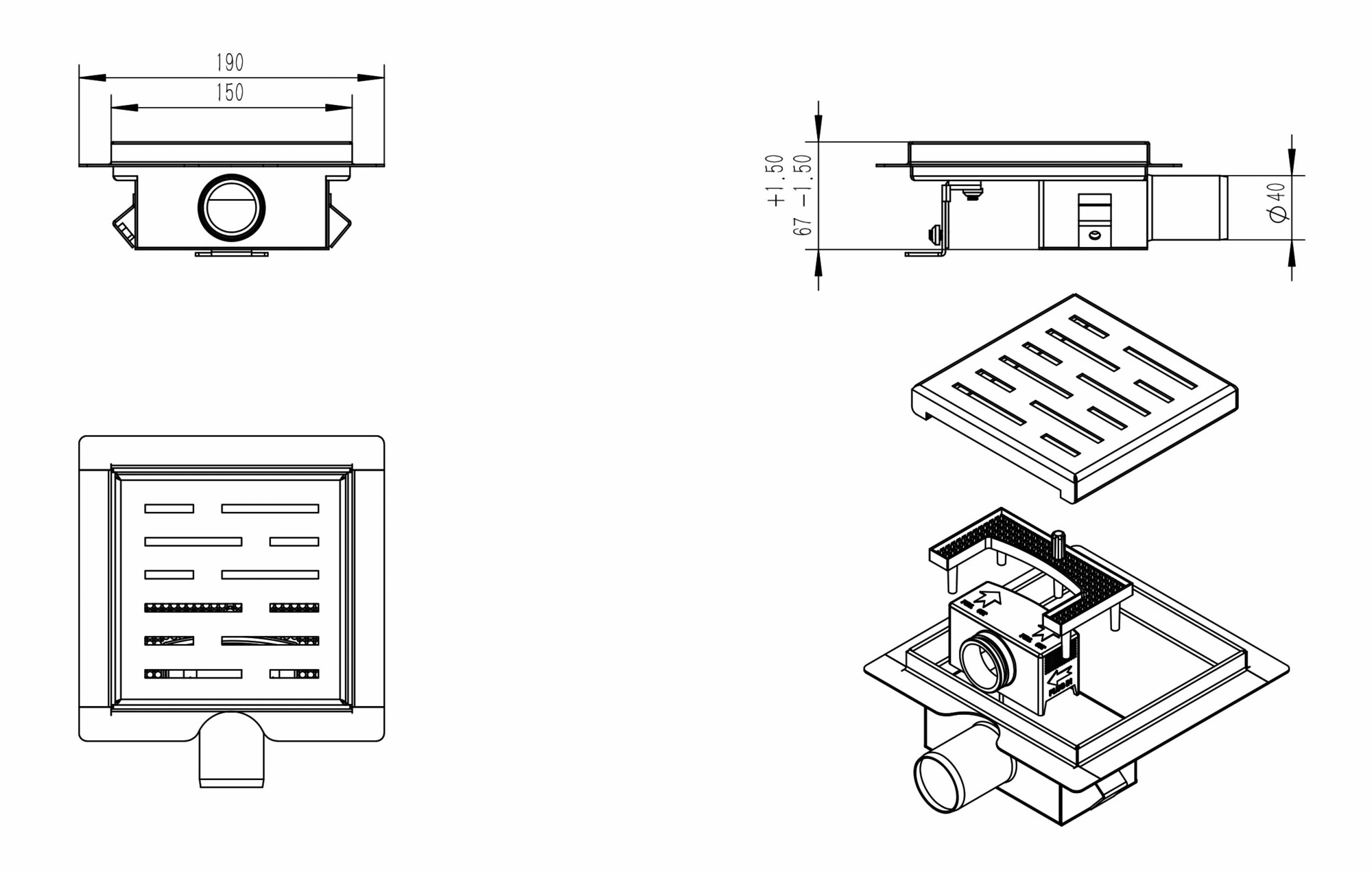 Wiesbaden doucheput met flens en zijuitlaat 15×15 cm mat zwart
